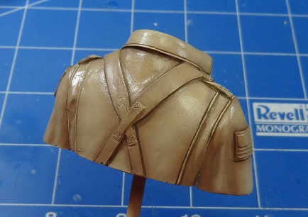 5) Torso: I started by working with my airbrush. First a sand color was applied as a base coat. Then i added brown to the base color to paint the shadows. I increased contrast by adding white to the base color and applying it to the more superficial parts of the kit.