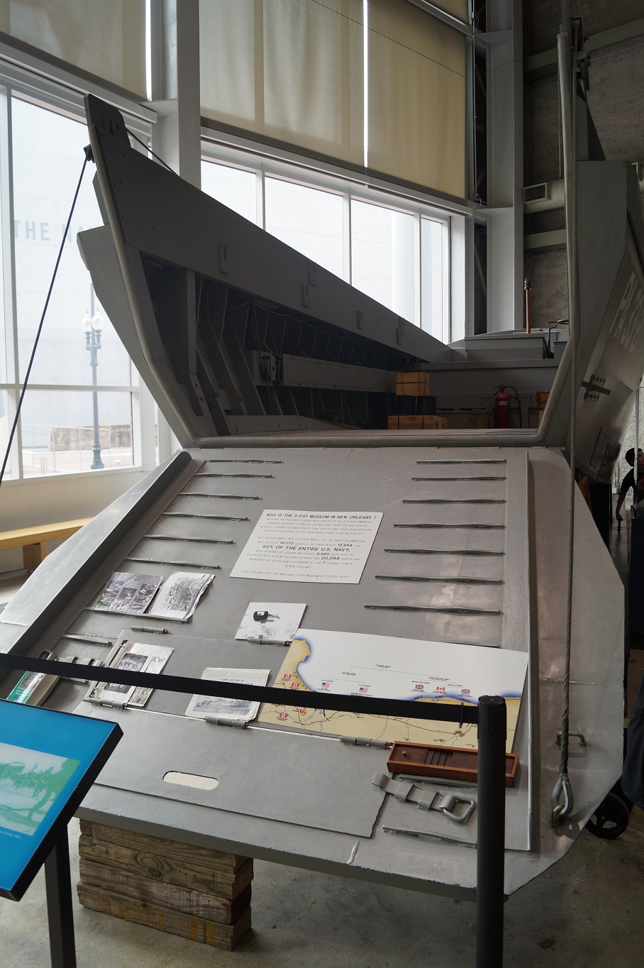 Comments: The landing craft, vehicle, personnel (LCVP) or Higgins boat was a landing craft used extensively in amphibious landings in World War II. The craft was designed by Andrew Higgins based on boats made for operating in swamps and marshes. More than 23,358 were built, by Higgins Industries and licensees. Typically constructed from plywood, this shallow-draft, barge-like boat could ferry a roughly platoon-sized complement of 36 men to shore at 9 knots (17 km/h). Men generally entered the boat by climbing down a cargo net hung from the side of their troop transport; they exited by charging down the boat's lowered bow ramp. Taking the last letter of the LCVP designation, sailors often nicknamed the Higgins Boat the "Papa Boat" or "Peter Boat" to differentiate it from other landing craft such as the LCU and the LCM, with the LCM being called the "Mike Boat.